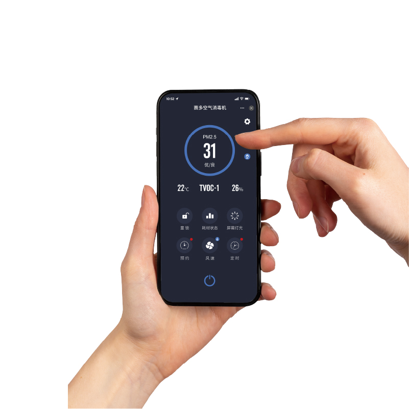In addition to touchscreen and hand gesture controls, the unit can be connected to a mobile application, enabling remote operation. Through the app, users can remotely control the unit, monitor indoor air quality, check filter lifespan, and schedule operating times.