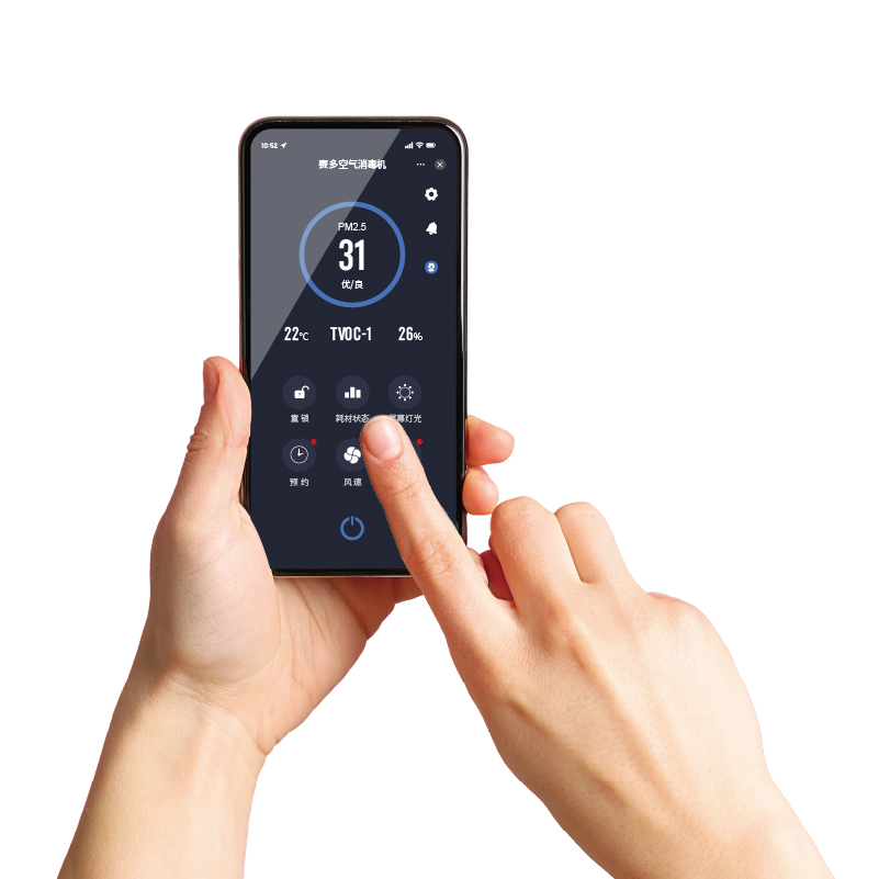 通过手机App,用户可实现对设备的远程操控,实时监测室内空气质量,查看滤芯剩余时间,并可预约设定设备的开关机时间。