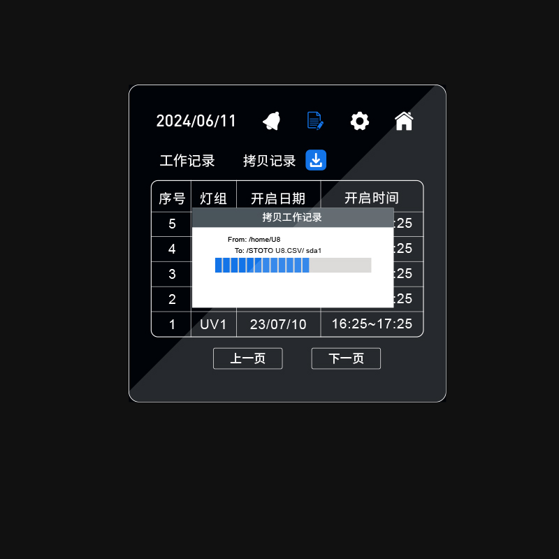 开启紫外灯,形成工作记录。自动累计紫外灯工作时间,及时提示用户更换紫外灯。