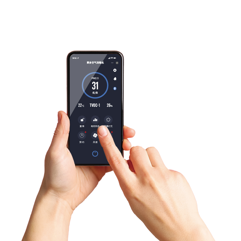设备支持与手机App连接,用户可通过App远程控制设备各项功能,实时查看空气质量状况及滤芯、紫外灯管剩余使用时间,并可设置预约运行。
